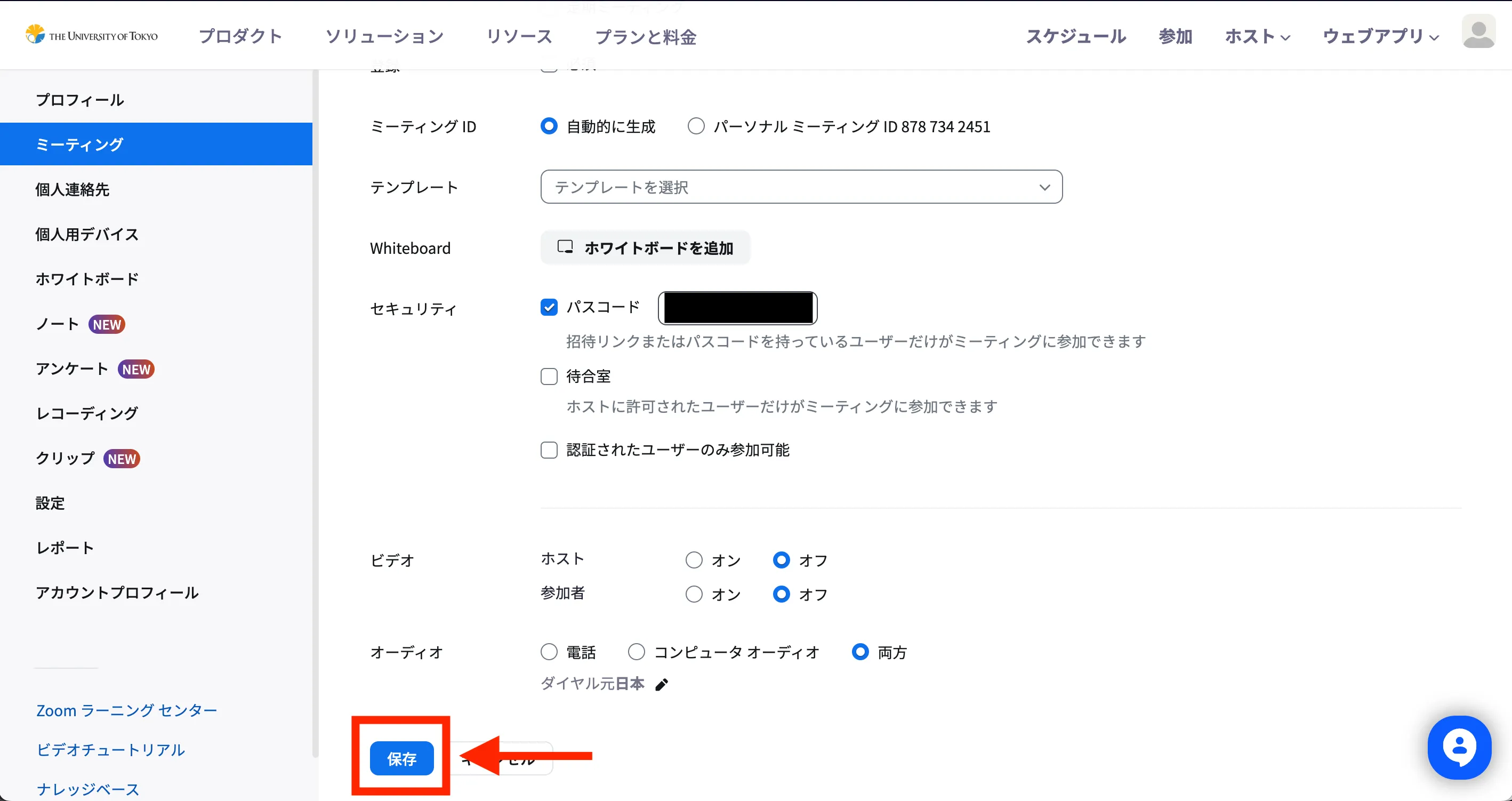 - 「保存」ボタンを選択してください.Zoomミーティングが作成されます.