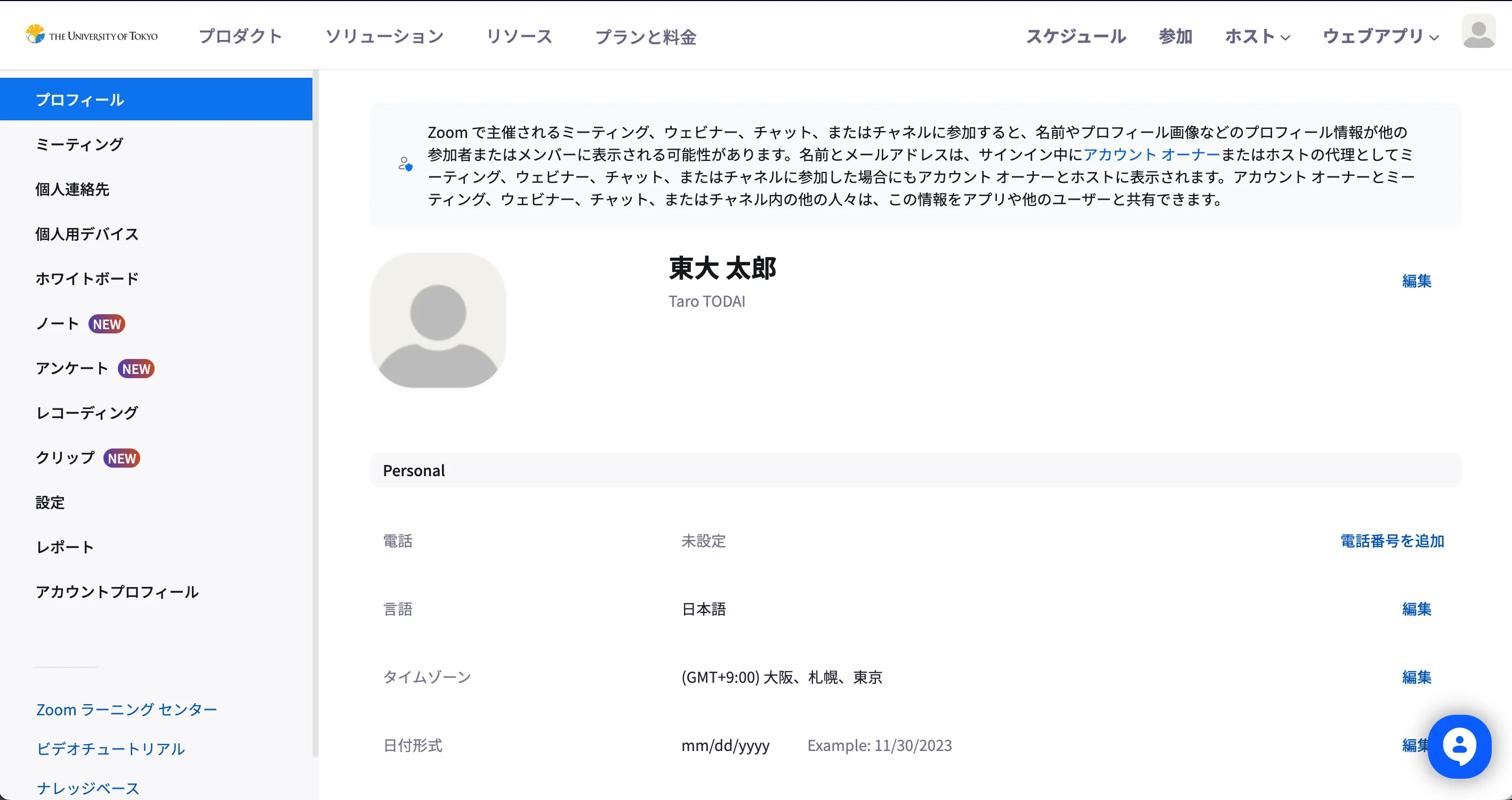 - WebブラウザでZoomのマイプロフィールへアクセスしてください.