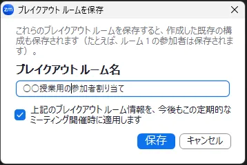 通常のミーティングでは,開催するたびにブレイクアウトルームに参加者を割り当てる必要があります.しかし,繰り返し使われる「定期的なミーティング」では,次も同じ割り当てを使うときのために,現在のブレイクアウトルームへの参加者の割り当てを保存することが可能です.割り当ては1ユーザーにつき最大10種類まで保存できます.参加者の割り当てを保存する手順は以下の通りです.