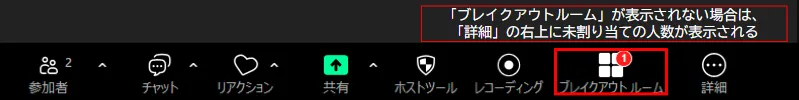 遅れてメインミーティグに入室した参加者がいる場合は,ミーティング画面下部の「ブレイクアウトルーム」(ブレイクアウトルームのボタンが表示されていない場合は,「詳細」)の右上に赤文字でその人数が表示されます.ブレイクアウトルーム実施中は,遅れてきた参加者が未割り当てのままになっていないか,注意してください.