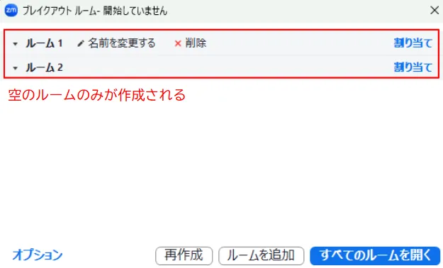 • 空のルームを追加する場合:ウィンドウ下部の「ルームを追加」を押してください.作成されたルームには,手動で参加者を割り当てる必要があります.