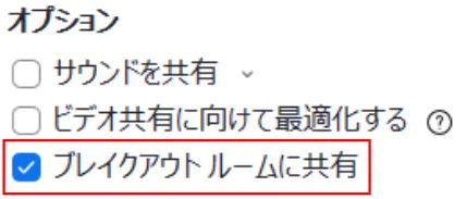 2. ウィンドウの「オプション」欄にある「ブレイクアウトルームに共有」をオンにしてください.端末の音声も共有する場合は,「サウンドを共有」もオンにしてください.