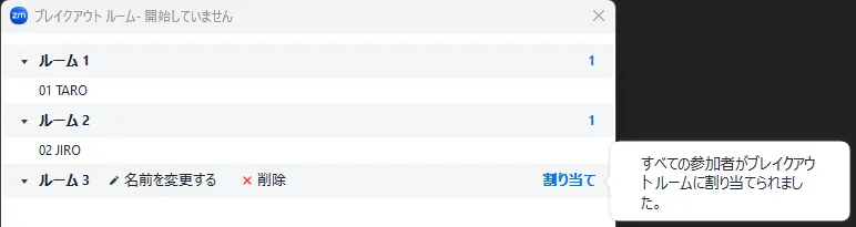 4. 割り当てたい参加者が全員ブレイクアウトルームに割り当てられていることを確認してください.