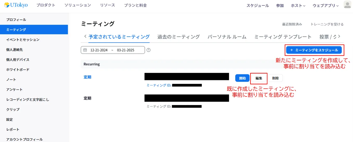 3. 割り当てが読み込まれたミーティングを新しく作成する場合は「ミーティングをスケジュール」を,すでに予定されているミーティングに割り当てを読み込む場合は「編集」を押してください.